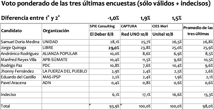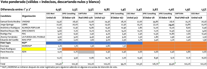 (El registro explÃcito de las encuestas en esta larga noche… perdón, perÃodo precomicial en Bolivia se prohÃbe en los dÃas del silencio electoral —14 al 17— pero no es óbice en un medio internacional como E-lecciones. Sigamos adelante).